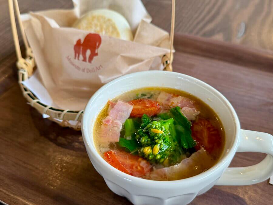 玉ねぎのやさしい甘みとトマトの酸味、菜の花のほんのりとした苦みが広がります。