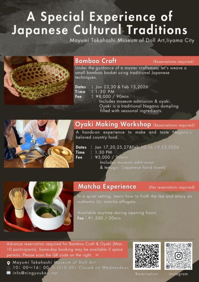 当館では1月から、日本・長野県の伝統文化を体験いただけるワークショップを開催いたします。 竹細工、おやき、抹茶の3つのプログラムを通し、特別な旅の思い出を作ってみませんか。