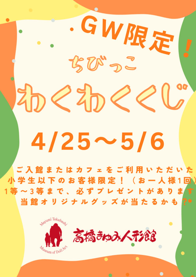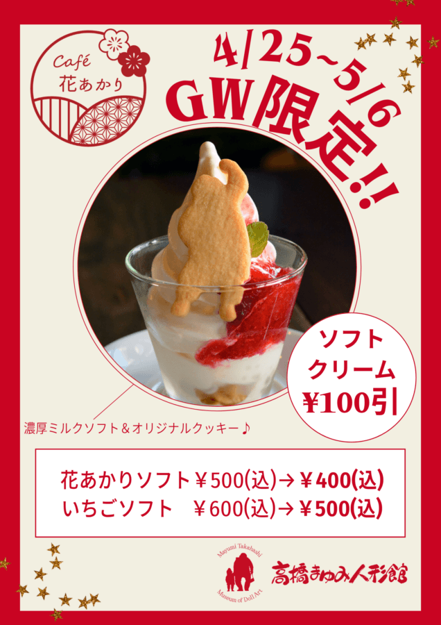 イベントお知らせ ゴールデンウィーク限定イベント開催中! 2026.04.27 GW期間限定イベント開催しております♪ ご家族そろってぜひお越しください! ①併設 café花あかり ソフトクリーム100円引き ・花あかりソフト ¥500 → ¥400 ・いちごの花あかりソフト ¥600 → ¥500 ② ちびっこワクワクくじ ご入館またはカフェをご利用いただいた 小学生以下のお客様限定!(お一人様1回) 1等〜3等まで、必ずプレゼントがあります 当館オリジナルグッズが当たるかも?